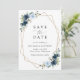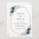 Invitations amis et famille dans le style et donner le ton pour votre journée spéciale avec ce charmant enregistrer la carte de date. Le design présente des fleurs marine et bleu aquarelle, de la verdure et un cadre doré sur l'arrière - plan blanc.