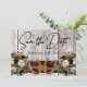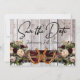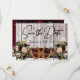 Ce design a une élégance rustique, en gardant un thème simple. Fond en bois de grange avec ruban bordeaux, des fers à cheval noués et des bouquets de fleurs sauvages avec des espaces réservés pour la date sur le devant. Espace réservé pour une photo du couple au dos de la carte avec les noms, et lettrage "Gettin 'Hitched" sur un fond de ruban assorti. Conçu pour coordonner avec la collection "Gettin 'Hitched - Horseshoes, Ribbon & Lace". Pour modifier les détails, cliquez sur «Personnaliser». Pour déplacer le texte ou modifier la taille, la police ou la couleur du texte, cliquez sur «Cliquez pour personnaliser davantage».