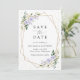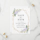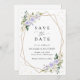 Invitations amis et famille dans le style et donner le ton pour votre journée spéciale avec ce charmant enregistrer la carte de date. Le design présente des fleurs d'aquarelle violette et blanche, de la verdure, des confettis dorés et un cadre doré sur un arrière - plan blanc.