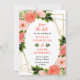 This fun and whimsical save the date invitation features watercolor coral pink red roses and foliage on a gold geometric frame. The text combines handwritten script and serif fonts for a stylish and modern look. This is perfect for a spring or summer rustic wedding.