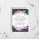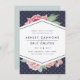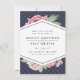 Élégant, enregistrez les cartes datées avec un mélange chic de flores vintages d'aquarelle et d'éléments géométriques modernes sur un arrière - plan bleu nuit subtilement modelé. Un spray de fleurs de pivoine rose vif pointe du haut et du bas d'un élément central en forme de losange en bleu nuit, tenant vos noms et détails mariages dans des lettres propres et modernes.