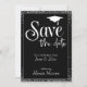 Using two distinctive fonts, I've created graphics for your announcement. The header reads "Save the date" and above it is a graphic depicting a graduation cap. All text was placed over a bordered black rectangle which overlays another black background. Coordinating white confetti over this furthest black background completes the border effect. Change the background colour to anything you like! The graduation cap also appears on the back. // 130, 131 //