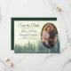 Ces belles cartes sont le moyen parfait de faire savoir à vos amis et à votre famille de sauver la date pour votre prochain mariage. Elles présentent un design extérieur rustique avec une forêt de pins verdoyante entourée de brume ou de brouillard, et votre photo dans un cadre ovale. La légende indique Enregistrer la date avec de l'espace pour vos noms, la date et l'emplacement. Le dos est une couleur verte foncée marbrée.