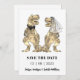 Dégustez vos invités avec cette drôle de dinosaure thème mariage T Rex marié et marié enregistrer la date. Facile à customiser avec les noms des mariés et des mariés et la date du mariage. Eau amusante T Rex mariée et illustrations de mariés avec typographie moderne. Oeuvre originale unique de l'artiste Catherine Sweetman