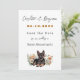 Wedding save the date announcements with German Shepherd dog design. The puppy lies among wildflowers in the design at the bottom of white paper. Black text is used in script and printed fonts, except for the date which is rust orange.