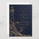 An elegant night-time coastal wedding design featuring a luminous gold lighthouse illustration set against a deep navy backdrop. Flowing ocean waves, celestial accents, and refined metallic linework create a dramatic, high-end atmosphere inspired by seaside evenings and maritime romance.