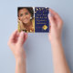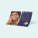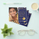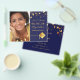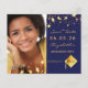 On front: Add your own vertical size photo of the graduate. A chic navy blue background color, decorated with faux gold stars. Personalize and add a name and date. Golden letters. The name and the text: Save the Date are written with a modern hand lettered style script.