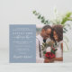 Réception de mariage bleu poussiéreux et chic enregistrez l'annonce de la date qui présente votre photo et "Happily Ever After Party" dans la typographie blanche moderne et un script blanc élégant avec des swashes. Customisez de sauvegarder les détails de la date et d'ajouter vos noms dans un script de type signature.