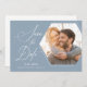 Cette photo moderne enregistrer la date annonce dispose d'un cadre photo hexagone sur un arrière - plan bleu clair poussiéreux. Le design est accentué par un script élégant, et du texte personnalisé pour la date, les noms et l'emplacement du mariage. Le texte supplémentaire, à l'arrière, vous permet d'ajouter plus de détails mariages.