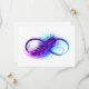 Infinity symbole with a beautiful feather painted in purple and blue bright colors on white background