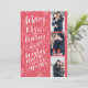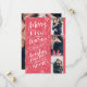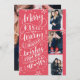 Ce carte photo de vacances moderne et chic sert aussi de carte d'enregistrement pour le couple nouvellement engagé. Le devant présente 3 de vos photos accentuées de flocons de neige dessinés à la main et de typographie lettrée à la main qui dit "Baisers joyeux et voeux chauds de vacances du Bientôt être M et Mme" sur un arrière - plan rouge. Le dos comprend une photo complète avec votre enregistrement des détails de la date.