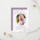 Cette carte Save the Date présente une belle conception avec votre photo dans un cadre ovale entouré de lavande ou de lettres violettes légères sur un arrière - plan blanc, et frileusement faux feuille argent gris dans les coins. Il y a de la place pour le nom du couple, l'emplacement du mariage et le site Web. Une façon élégante et chic de faire savoir à vos amis et à votre famille de sauver la date pour votre jour spécial.