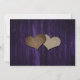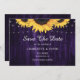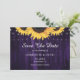 Carte de mariage rustique violet et jaune avec fleurs de tournesol et guirlandes lumineuses sur un fond en bois rustique.