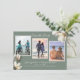 Mariage à thème du sud enregistrer les cartes de date avec trois modèles photo. Des fleurs de magnolia blanches et méridionales ornent les coins de cartes horizontales gris-vert. Les modèles photo sont en escalier avec la gauche un peu plus haut que le centre et la photo de droite un peu plus bas. Les photos de l'une ou l'autre orientation fonctionneront si le sujet est au centre. "Enregistrer la date" en haut, avec les noms complets, la date et le lieu du mariage en bas. Les couleurs correspondent à la collection de papeterie magnolia méridionale. Montré sur les cartes de taille plus petite.