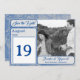 Design présente un élégant effet de marbrage bleu et gris comme arrière - plan à votre photo et texte. Le texte comprend l'en-tête "Save the Date!" ci-dessus l'image d'une Calandre quotidienne qui affiche clairement la date. La photo est affichée à droite. Les noms des futurs mariés et futurs mariés et de la ville du mariage sont affichés ci-dessous. Conçu pour se coordonner avec la "Suite Mariage en marbre bleu et gris".