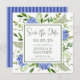 Cette carte de sauvegarde de la date de mariage aux hydrangeas bleus est parfaite pour informer les invités de réserver la date de votre mariage à venir. Avec ses hydrangeas bleus multicolores à l'aquarelle, sa verdure naturelle vaporeuse et son dos rayé bleu, elle est idéale pour partager votre joie et votre excitation avec vos amis et votre famille. Tout le monde sera ravi de se joindre à vous pour célébrer votre jour de mariage !