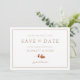 Automne | Fall Leaves Wedding Save the Date. Ce mariage élégant et simple sauvez la date dispose d'une belle branche de cuivre aquarelle et de feuilles rouille sur un arrière - plan blanc avec une bordure et un texte bronzés. Le dos est d'un blanc simple.