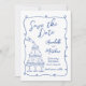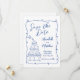 Cadre de tournage en bleu et blanc d'inspiration européenne Enregistrer la carte de date. Cette carte fantaisiste et créative, inspirée par l'élégance italienne, française et européenne, est parfaite pour les couples qui veulent donner un ton ludique mais raffiné à leur prochain mariage. Conçue dans une palette classique bleu et blanc, la carte dispose d'un cadre tourbillonnant avec des détails de coeur qui entourent vos informations mariages, présenté dans un charmant mélange de script et de polices manuscrites de style pour une sensation décontractée et sophistiquée. Une illustration vivante d'une tour en verre de champagne avec une bouteille coulant de mousseux sur le dessus ajoute une touche festive et artistique au coin inférieur gauche. Ce détail enchanteur se marie harmonieusement avec le cadre pivotant, créant un design à la fois unique et mémorable. Le dos de la carte met en valeur un accent sucré, un monogramme manuscrit des initiales du couple accompagné d’un croquis d’une bouteille de champagne et d’une vitre, associant le thème au charme européen. Entièrement personnalisable, ce design est idéal pour les couples à la recherche de quelque chose de design, de tendance et de personnalité. Disponible en version imprimée ou sous forme de fichier numérique téléchargeable pour un partage aisé ou une impression locale.