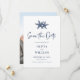 Ce mariage minimaliste de plage moderne, à l'exception de la carte date, a un arrière - plan blanc avec du texte bleu marine, deux étoiles de mer en haut, et une calligraphie manuscrite tendance, avec un modèle photo à l'arrière.