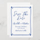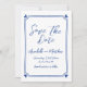 Simple main tiré Whimsical Blue Wedding Enregistrer la date. Cette carte européenne d'inspiration bleue et blanche Save the Date présente un design épuré et minimaliste, parfait pour les couples à la recherche d'une élégance intemporelle. Un subtil cadre dessiné à la main avec de charmants coeurs bleus dans chaque coin encercle délicatement vos détails mariages, présenté dans un mélange de script et de polices manuscrites de style pour un look à la fois élégant et personnel. Le dos comprend un monogramme personnalisé des initiales du couple, ajoutant une touche soignée et raffinée. Inspiré par l'esthétique européenne classique avec des touches de charme italien et français, ce design est entièrement personnalisable pour correspondre à votre thème mariage. Qu'il soit imprimé ou partagé numériquement, il offre une façon sophistiquée mais ludique d'annoncer votre journée spéciale.