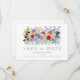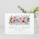 Faire-peinture aquarelle de fleurs sauvages et de feuillage pour invitation de mariage "save the date" dans des tons rose, bleu bleuet, bleu marine, violet, rose, jaune, rouge, bordeaux, magenta et vert. Personnalisez les initiales du monogramme de la mariée et du marié au dos de l'invitation. Idéal pour une invitation de mariage "save the date" unique pour un mariage de printemps ou d'été. La typographie moderne élégante en gris ardoise complète l'œuvre d'art bohème fantaisiste et magnifique qui comprend des bleuets, des pavots, des cosmos, des myosotis, des marguerites, des boutons de billy et un feuillage délicat. Invitations de mariage bohème chic "save the date" parfaites pour un mariage dans une prairie printanière ou un jardin d'été. Œuvre originale de l'artiste Catherine Sweet