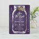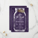Mariage rustique violet enregistrez la carte de date avec un pot de mason et les coeurs de burlap contre un arrière - plan en bois de grange orné de lumières scintillantes. Personnalisez facilement ce mariage romantique rustique violet enregistrer la date en ligne. Objets correspondants disponibles pour compléter ce mariage violet enregistrer la carte de date.