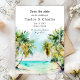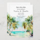 Cette aquarelle élégante et belle à sauver l'invitation de la date dispose d'une plage, ciel bleu et palmiers. Le texte combine écriture manuscrite et polices sans serif pour un look élégant et moderne. Il est parfait pour une plage d'été ou un mariage de destination tropicale.