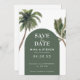 Le Bohemian Green Arch Palm Tree Wedding Save the Date présente un design fantaisiste avec des palmiers verdoyants formant une arche, parfait pour annoncer votre journée spéciale avec un charme bohème et une touche tropicale.