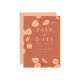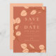 Elégant minimaliste eucalyptus feuilles tournoyant dans la pêche avec ligne orange foncé détails art sur un mariage arrière - plan orange terre cuite enregistrer la date. Script de typographie moderne personnalisé avec modèle facile à utiliser. Un simple chic belle ligne de vert eucalyptus simpliste dessin dans un modèle de couronnes simple mariage enregistrer la date invitation disponible imprimé et en tant que numérique téléchargeable. Unique jardin botanique en terre cuite teintes de coucher de soleil oeuvre de l'artiste Catherine Sweetman idéal pour un mariage de printemps, d'été, d'automne ou d'hiver.