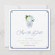 Vase à gingembre bleu et blanc intemporel et élégant rempli de fleurs bleues, blanches et vertes et d'une bordure "clé grecque" et d'un support à motif. J'ai configuré le modèle pour une invitation "Save the Date" pour un mariage, mais tous les champs de texte sont personnalisables selon vos besoins. Vous ne pourrez pas modifier vous-même la police "Save the Date". Si vous avez besoin de ceci avec un autre texte, veuillez m'envoyer un message. Vous pouvez déplacer, supprimer ou ajouter des champs de texte en entrant dans l'outil de conception. Vous pouvez également changer la couleur de contraste de la bordure de clé grecque sur le devant et le motif au dos (représenté ici par un bleu foncé) en n'importe quelle couleur que vous aimez en entrant dans l'outil de conception (sous la zone de personnalisation du texte, cliquez sur "personnal
