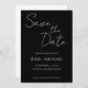 Cartes de faire-part de mariage de style simple qui présentent une écriture stylisée blanche sur un fond noir uni. Modifiez et remplacez les noms, la date et le lieu par les vôtres. Sélectionnez la taille de votre invitation et le style de papier.