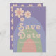 Invitation de mariage à thème rétro moderne avec arche de marguerites et couleurs pastel. Motif minimaliste de marguerite rétro cool avec design d'arche arc-en-ciel en rose pêche, vert, bleu et lilas lavande violet. Cette carte de sauvegarde de date amusante et hippie est facile à personnaliser en utilisant les modèles simples. Idéal pour donner le ton à un mariage d'été, de printemps ou d'automne. Œuvre originale de l'artiste Catherine Sweetman