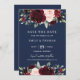 Cette élégante carte de sauvegarde de date présente un bouquet de feuillage floral et de verdure à l'aquarelle burgundy rustique, bleu marine et teinté de rose. Idéal pour toutes les saisons.