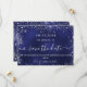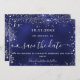 Un moderne et élégant Save the Date pour un mariage. Un arrière - plan bleu marine décoré de faux éclats d'argent. La couleur bleue est dévoilée. Personnalisez et ajoutez une date et des noms. Le texte : Save the Date est écrit avec un grand script de style à la main tendance avec des swashes. Ajoutez votre URL Web à votre propre site Web mariage à l'arrière pour créer un code QR.