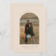 Une simple et élégante carte de rappel de mariage beige, conçue avec une arche au milieu et des lettres cursives au dos. Personnalisez avec les détails de votre futur mariage sur le recto et le verso de la carte.
