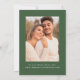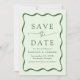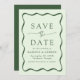 Annoncez votre prochain mariage dans le style avec notre photo Modern Wavy Frame enregistrer les dates! Le design présente vos noms et détails mariages encadrés par un cadre ondulé vert foncé contrastant avec un arrière - plan vert clair. L'arrière du rétro enregistrer la date comprend votre photo fiançailles verticale avec votre site mariage affiché ci-dessous. Ce mélange exquis de design moderne et rétro assure que votre sauvegarde de la date n'est pas seulement un rappel de votre célébration à venir, mais un gardien chéri qui capture l'essence de votre histoire d'amour.