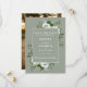 Cette carte rustique et élégante de mariage floral vert saute à l'aquarelle peut être personnalisée avec vos informations dans la typographie moderne et une photo spéciale au verso. Conçu par Thisisnotme©