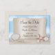 Élégant enregistrer les annonces de dates pour un mariage sur le thème de la plage avec des coquillages, des dollars de sable, une étoile de mer, et un message, sur un ciel bleu.