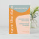 Formes abstraites rétro vintage style années 70 mariage unique enregistrer la date avec une typographie audacieuse dans une palette de couleurs chic pastel bleu poussiéreux, orange et rose clair tendance moderne bohème. +++++++ Veuillez noter que toutes les couleurs sont changeables. ++++++++++++ La carte convient aux mariages décontractés et élégants contemporains.