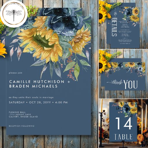 Célébrez la chaleur et la vitalité de votre amour avec ce magnifique mariage de tournesol, enregistrez la carte de date. Les teintes jaunes et marron des tournesols, complétées par les pavots bleus poussiéreux et le feuillage vert luxuriant, créent une atmosphère captivante et joyeuse. L'arrière - plan bleu foncé apporte une touche de sophistication, tandis que la police blanche propre assure un look moderne et élégant. Ce design est le choix idéal pour un mariage d'été, saisissant l'essence du bonheur et de la célébration. Laissez vos invités être attirés dans la chaleur et la beauté de votre journée spéciale avec ce design étonnant. Créé par Simply Farmhouse Press.