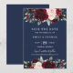 Cette élégante carte de save the date présente un bouquet rustique à l'aquarelle de fleurs burgundy, bleu marine, rose et feuillage de verdure. Parfait pour toutes les saisons.