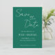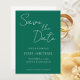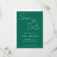 Cartes de faire-part de mariage simple style qui présentent une écriture stylisée blanche sur un fond tendance de couleur vert émeraude. Modifiez et remplacez les noms, la date et le lieu par les vôtres. Sélectionnez la taille de votre invitation et le style de papier.