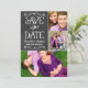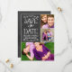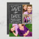 Faire part de mariage carte annonce originale et fantaisiste recto-verso avec collage de photos, avec un aspect de texture rustique sur fond de tableau noir et des polices de caractères écrites à la main qui ont l'apparence de la craie blanche. Personnalisez avec les détails du mariage et trois (3) de vos photos de fiançailles préférées.
