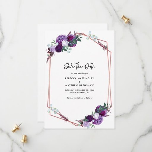 Notre collection géométrique fleurie violette est parfaite pour créer un faire-part pour votre mariage. Doté d'une calligraphie noire moderne, avec cadre géométrique or rose sur arrière - plan blanc, il est parfait pour une annonce Save the Date. CONSEIL : Les cartes RSVP, la faire-part de mariage, la Fête des mariées et bien d'autres sont disponibles dans cette suite de mariage conçue pour votre commodité