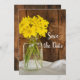 Donnez un ton décontracté mais élégant pour votre cérémonie de mariage imminente avec le Mason Jar et les marguerites jaunes Pays Mariage de la grange Enregistrer la date Annonces. Ce mariage informel et élégant à thème ranch personnalisé garder le faire-part date dispose d'une photo fleurie numériquement pittoresque rehaussée d'un bocal en verre avec fleurs de marguerite jaune et un arrière - plan rustique en bois de grange brun patiné.