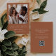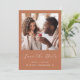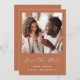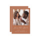 Cette simple et minimaliste carte Save the Date présente une photo carré au-dessus des mots "Save the Date" dans un élégant script d'écriture manuscrite blanche, suivie des noms du couple, date du mariage et ville en sans serif font sur un arrière - plan en terre cuite. Ajoutez un message plus détaillé avec des informations supplémentaires sur l'inverse, ainsi qu'un code QR qui envoie les invités à votre site Web mariage.