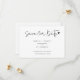 This Save the Date card features chic script typography with a subtle heart accent, creating a modern and elegant presentation. The clean layout highlights the couple’s names and wedding date in a clear and balanced format.