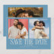 Simple and modern wedding save our date card featuring a text that says "SAVE THE DATE." 2 photos on the front and one on the back. The background is denim blue.
