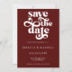 With a simple and modern design and retro typography, this elegant save-the-date announcement fits any wedding theme. It features a modern burgundy background and minimalist, and simple typography.