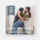 Modern, yet with a rustic flair, a photo of the beautiful couple fills the frame, and a pretty steely grey blue banner holds the month, day and year of the wedding date. A perfect keepsake magnet for letting guests know about the engagement and the wedding date.